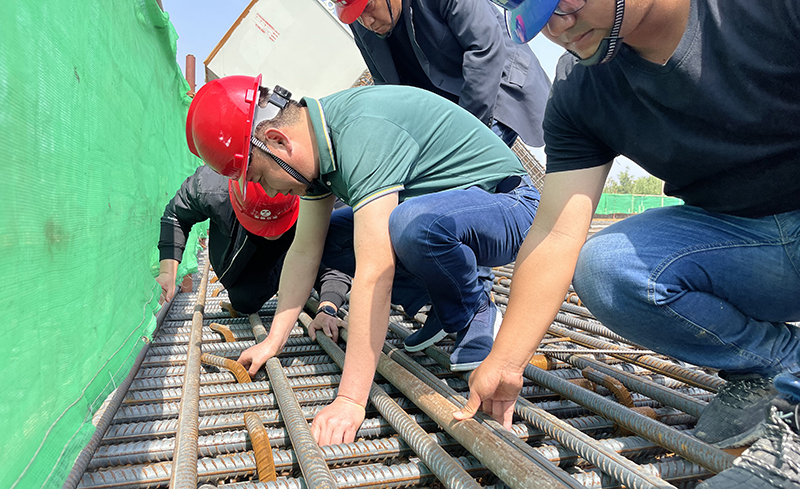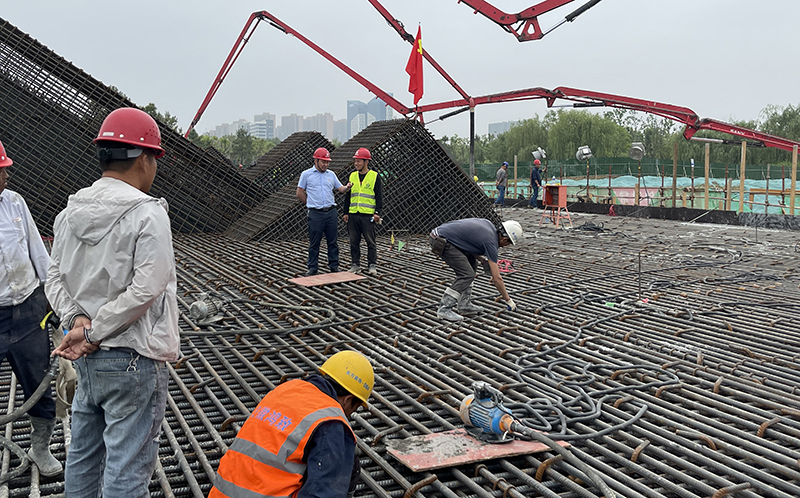 據(jù)悉,廣德路跨南淝河橋的關(guān)鍵節(jié)點(diǎn)主橋8號(hào)承臺(tái),采用不規(guī)格的矩形切角型,其承臺(tái)下設(shè)46根鉆孔灌注樁基礎(chǔ),設(shè)計(jì)總砼澆筑方量8869.2m3,本次澆筑方量4198m3。因整體澆筑體量大、技術(shù)要求標(biāo)準(zhǔn)高,為保障工程質(zhì)量,項(xiàng)目部精心組織、科學(xué)謀劃,編制《大體積混凝土專項(xiàng)施工方案》并經(jīng)專家多次研討論證通過。澆筑前項(xiàng)目部全力協(xié)調(diào)人、材、機(jī)配給,對(duì)現(xiàn)場(chǎng)安全施工標(biāo)準(zhǔn)、鋼筋制作綁扎、預(yù)埋件及冷卻管布設(shè)、施工及養(yǎng)護(hù)措施等進(jìn)行了詳細(xì)技術(shù)交底,將任務(wù)分解到人,責(zé)任落實(shí)到人,扎實(shí)做好各項(xiàng)準(zhǔn)備工作,以確保澆筑工作萬無一失。