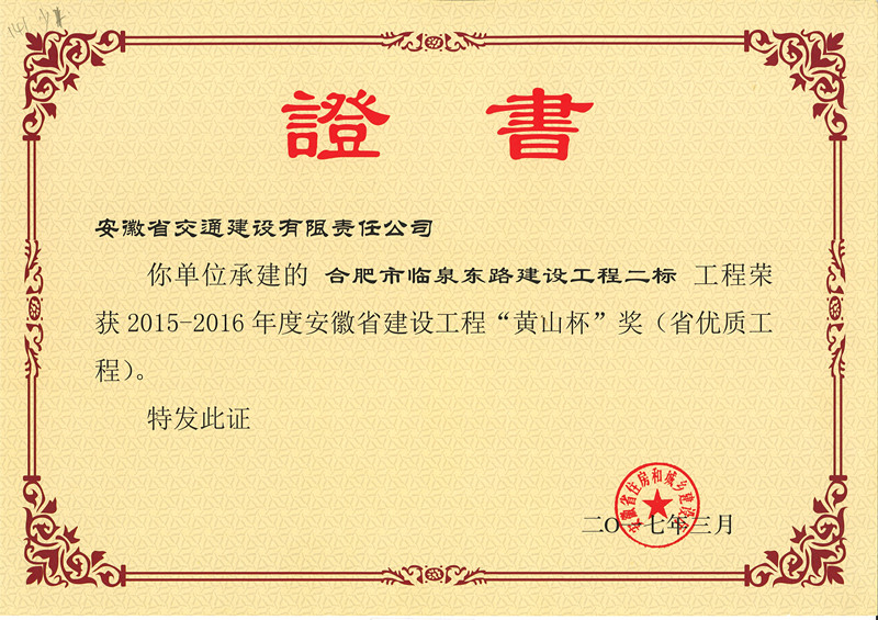 安徽省建設(shè)工程“黃山杯”獎(jiǎng)是安徽省建筑行業(yè)建設(shè)工程質(zhì)量的最高榮譽(yù)獎(jiǎng),黃山杯的評(píng)選對(duì)象為安徽省建筑施工企業(yè)在中國境內(nèi)承包、已經(jīng)建成并投入使用的各類工程,工程質(zhì)量標(biāo)準(zhǔn)需達(dá)到省內(nèi)一流水平。安徽交建自成立以來,積極調(diào)整發(fā)展思路,不斷加快市場(chǎng)開拓步伐,重點(diǎn)強(qiáng)化項(xiàng)目管理全過程控制,做好工程進(jìn)度、質(zhì)量、安全和現(xiàn)場(chǎng)文明施工管理,營造了良好的企業(yè)形象。